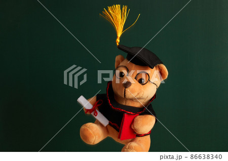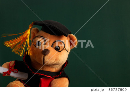 Teddy bear with graduation hat and diploma in front of green chalkboard. Graduation concept
