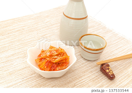 小海老入り魚肉すり身の佃煮と日本酒【白背景】