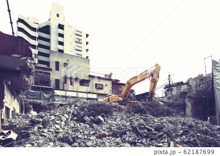 ショベルカーによる都市のビルの解体現場