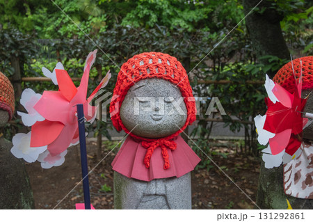 Stone Jizo statue wearing red knitted hat and bib in Japanese garden at Tokyo, Japan