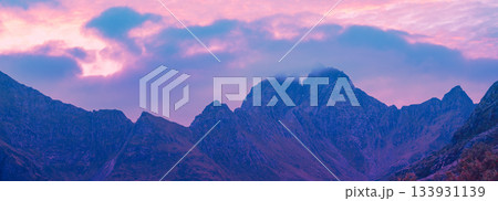 Beautiful mountains against the sunset sky. Silhouette of mountain peaks during sunset. Horizontal banner
