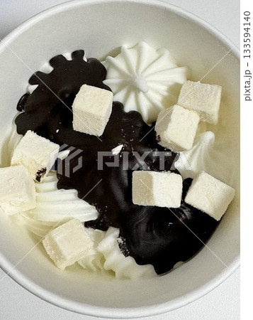 Swirled yogurt ice cream dessert served in a cup, smooth creamy texture with glossy surface, topped with fresh fruit pieces, highlighting its refreshing and inviting appearance in detail