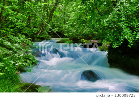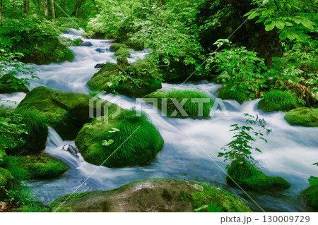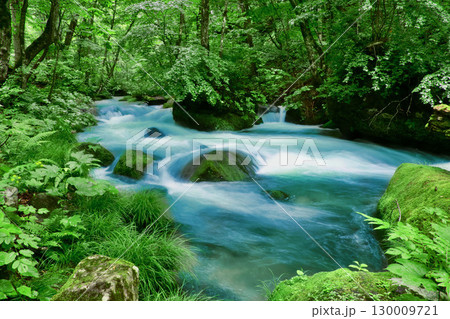 緑の中を流れる清流 奥入瀬渓流 石ケ戸の瀬 新緑と残雪