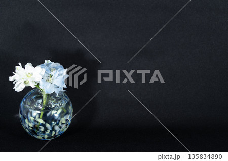闇に浮かぶ寒色ガラスの一輪挿しのデルフィニュウムの花(左配置)