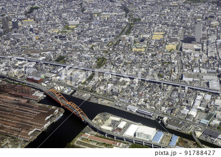 ハーバーハイウェイの灘大橋上空から石屋川公園方向を空撮