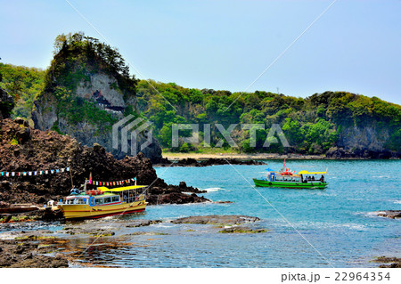 金沢・能登金剛・巌門の上の展望台より見下ろす、巌門近くを進む遊覧船