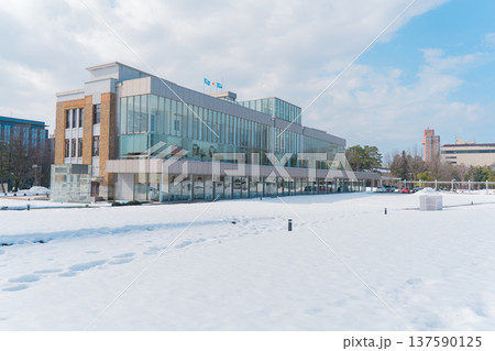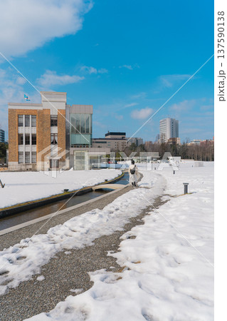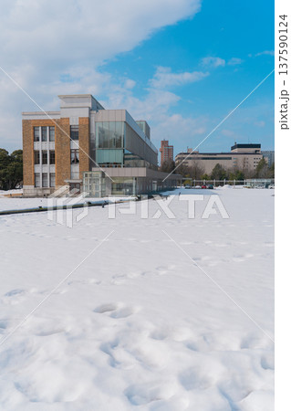 しいのき迎賓館から眺める雪の積もった金沢城公園