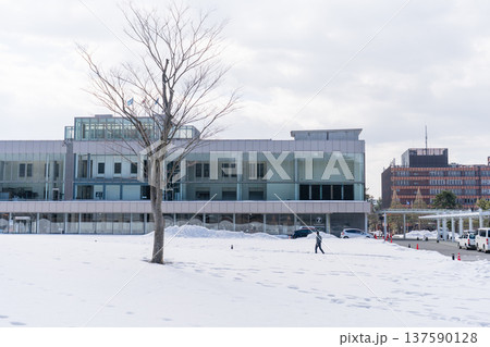 石川県政記念しいのき迎賓館と堂形のシイノキの雪景色