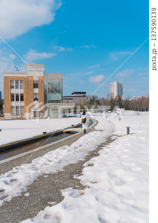 雪の石川県政記念しいのき迎賓館前を歩く人