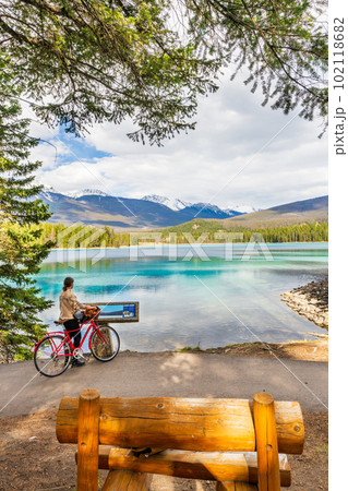 Alberta, Canada - May 9 2021 : Young girl cycling in Lake Annette lakeshore enjoying the nature scenery. Summer time in Jasper National Park, Canadian Rockies.