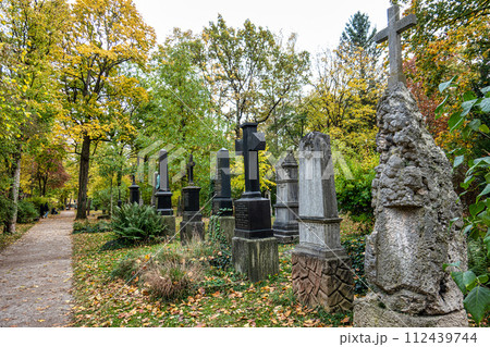 Autumn view of famous Old North Cemetery of Munich, Germany with historic gravestones.