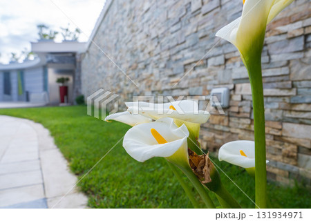 White calla lilies with yellow centers stand before a stone wall, a green lawn, and a modern building with a light facade and red door in the background.