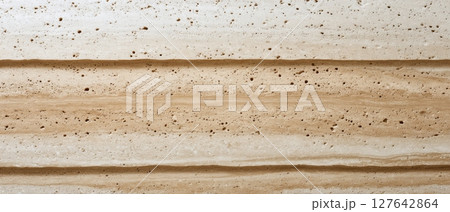 Travertine stone surface with soft brown sediment lines and porous white layers