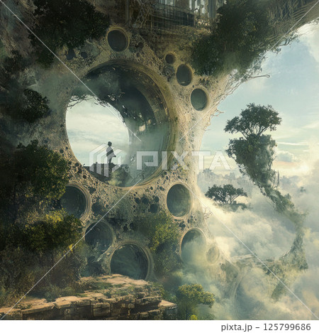 Person standing on a stone structure with circular openings, overlooking a surreal landscape of floating islands and misty clouds.