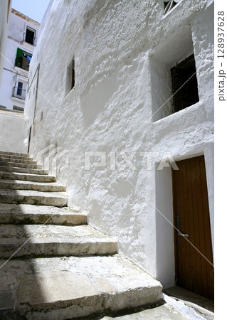 Nerja town, a resort of The Costa del Sol seaside region in Andalusia in the south of Spain. Ocean waves crashing against rocks on a sunny day. White foam and blue water create vibrant coastal scene.