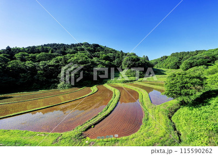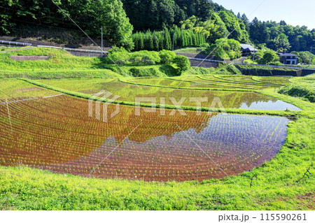 田植えの終わった入郷石畑の棚田/栃木県茂木町