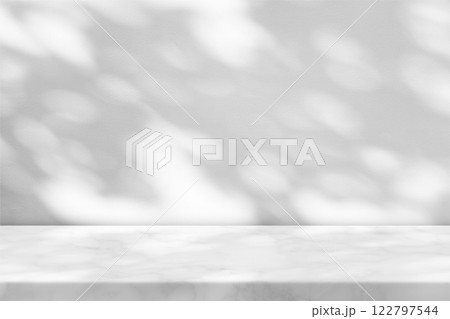 White Marble Table with Tree Shadow in the Garden on Concrete Wall Texture Background