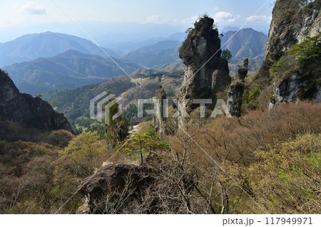 妙義山第四石門前広場からの第二石門や見晴台などの岩峰