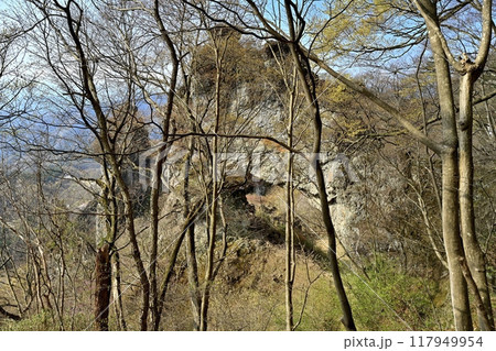 妙義山石門巡りコースの見晴台から第四石門と大砲岩の岩峰