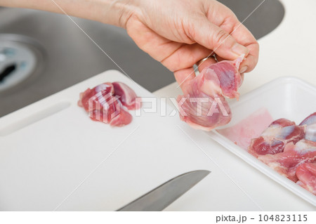 【焼き鳥砂肝の下処理をする主婦 包丁有】