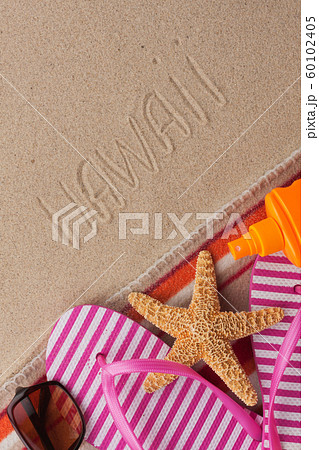 Word HAWAII written in sand with beach