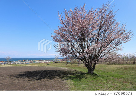 北海道 森 ハマナス台場公園の桜と砂原の街並み