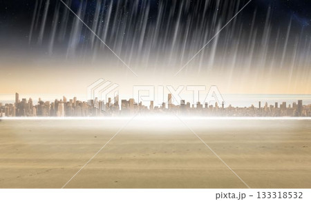 Flat illustration is showing desert plain meeting city skyline under starry sky with falling beams