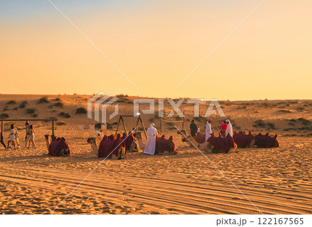 Camping in Hot Desert with Sand Landscape with Tourist and Arab Bedouin Vector Illustration