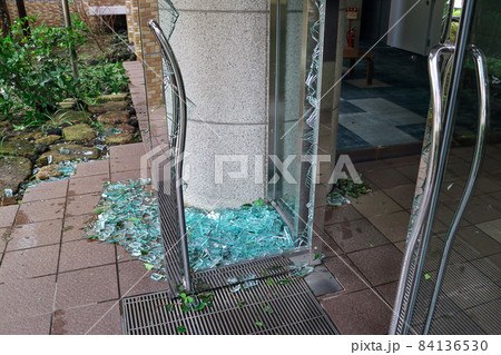 大型台風で粉々に割れたマンション入り口のガラス扉