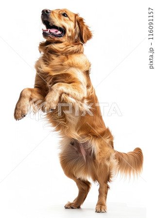 Golden Retriever dog Jumping and remaining in mid-air, studio lighting, stock photographic style