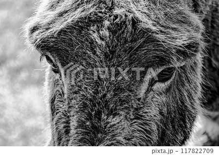 A close-up black and white image of a donkey's face, showing its eye and part of its forehead with fur.