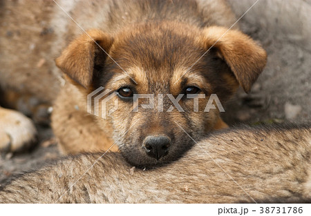 Homeless, sad puppy muzzle close up