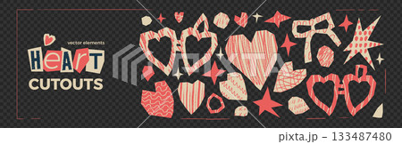 Hearts paper cutout set. Scrapbook love irregular icons. Collage locket, bowknot and doodle stars set. Scrap love red symbol stickers. Vector naive punk cut outs isolated on transparent background