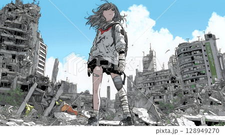 震災や空爆などで破壊された街で孤独に立ちすくむ若い女性