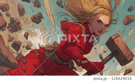 ハンマーを振るう女性戦士|迫力あるアクションシーンのダイナミックイラスト/象徴的スクラップ&ビルド