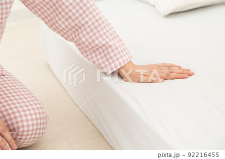 パジャマを着て寝室でマットレスの弾力を確かめるミドル女性