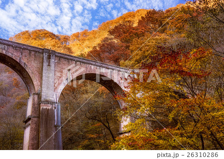 空撮 紅葉 群馬県めがね橋の風景 秋
