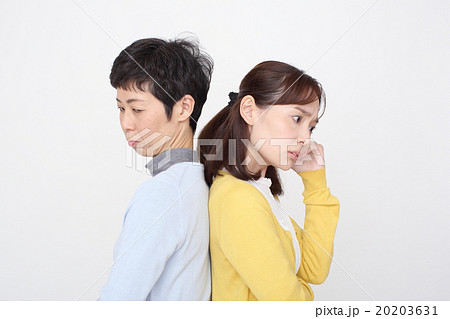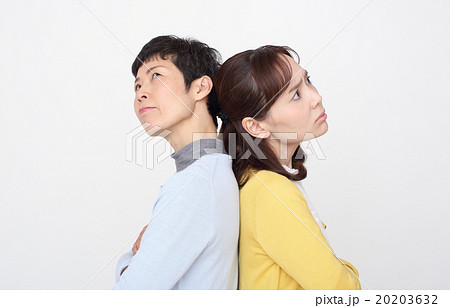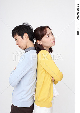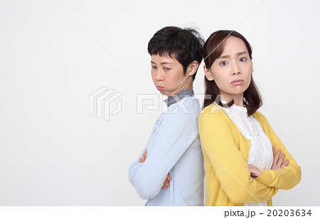 腕を組みそっぽを向いた不仲の若い男女、夫婦