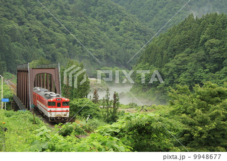 磐越西線「緑に囲まれて走る赤い列車」阿賀野川の川霧背景に