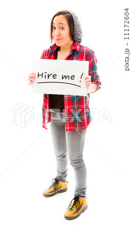 Young woman showing hire me sign