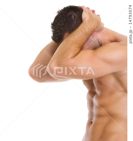 Closeup on muscular man showing biceps