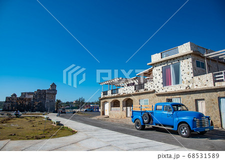 キューバ ハバナ マレコン通りの海岸が見える クラシックカー