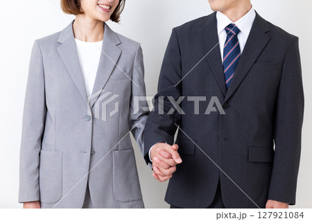 手を繋ぐスーツを着たミドル男性ビジネスマンと女性ビジネスウーマン