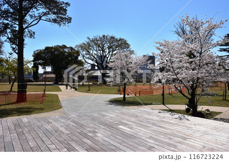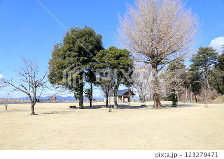 栃木県小山市 城山公園(祇園城跡)の中曲輪跡と満開桜と東屋