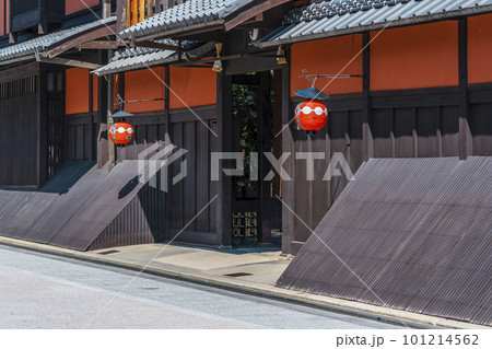 京都祇園の街並み 一力亭 都をどりの提灯 春