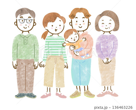 笑顔の三世代家族の全身イラスト素材