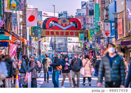 日本の東京都市景観 巣鴨地蔵通商店街などを望む。奥にJR巣鴨駅が見える