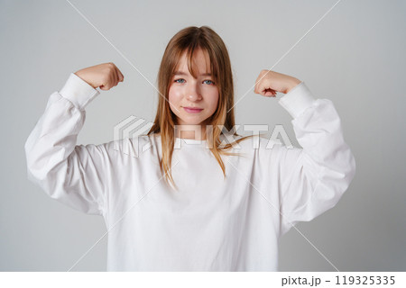 A joyful young girl with long hair wearing a white sweater stands against a plain background