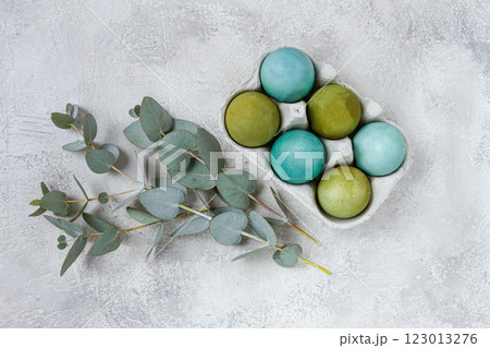 Easter colored eggs, in green and turquoise tones, with eucalyptus leaves, Easter card, top view, no people,