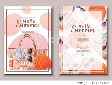 Flyer template set with summer accessories. Wicker bag, towel, sunscreen. Beach vibe, summer time. Banner poster, background for summer party, advertising promotion, invitation.